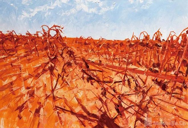 《葵原长卷》以浓重油彩堆叠出葵原的苍茫,葵杆如林、葵盘如炬,犹如一代人默然伫立于历史荒原。许江以画笔放牧葵园四季:春葵破土,颤栗生长;盛夏葵盘在浮雕般的色层中迎风舞动;秋暮垂首,籽实累累如岁月铭文;雪原枯葵则以破碎肌理隐喻涅槃后的守望,将个体岁月与集体理想镌刻为一代人的精神史诗。