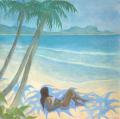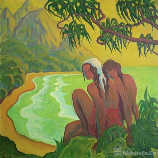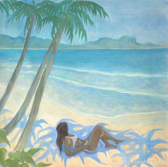在蔡猜的笔下,“热带”从一个地理概念,变成了一种感官氛围。在《如果一切只是热带的幻觉》系列作品中,画面的色彩湿润而饱和,仿佛具有重量与温度,构筑出一个既真实又超验的领域。作为冲浪者的长期身体实践,使她将冲浪不仅视为运动,更是一种嵌入世界的方式。她与浪点社群——一个依潮汐节奏聚散的现代游牧部落——建立了深刻连接。画面中那些被阳光浸透的肌肤、涌动的海浪与转瞬即逝的相遇,让地点不再是固定坐标,而是由身体经验与情感构筑的、流动的栖居地。