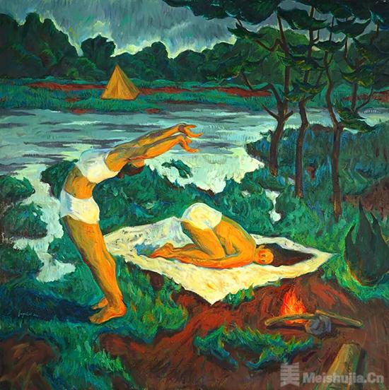 在《无因的喜悦》系列作品里,蔡猜使画中人物的身体不断的进行折叠与伸展,如同与空气、火光、树影进行着无声对话,有种一种神秘而原始的仪式感。喜悦是身体与世界共振时自然浮现的基底,关乎呼吸、凝视,以及在停顿瞬间意识到自己是自然的一部分。蔡猜在此剥离叙事,让画面回归知觉。画面中色彩的精微振动与形体的柔和张力,共同模拟着那种不被命名却可感知的体验。