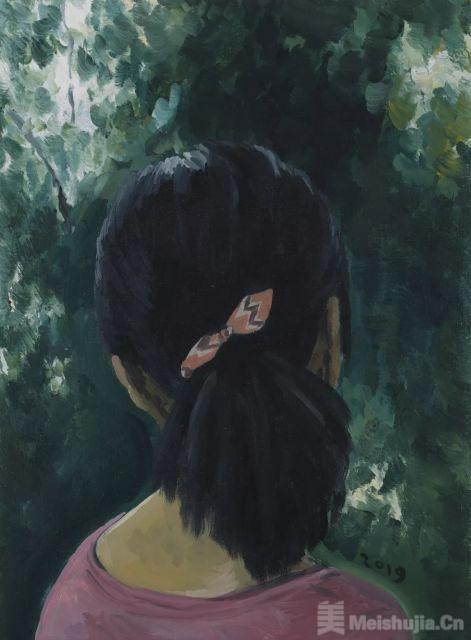 其二是关于命运叙事。这部分是基于当下日常生活中所熟悉的人与景的绘画。绘画中的人物多为背影或侧影,他们或是稚嫩的儿童、或是青春时代的女性,或是苍颜的老人,或是中风的病人。其中一些风景与故乡肖像有着同样的特征,而有些却有意地只呈现一颗死树或干枯的枝干。在这里,蒋建军通过不同的人、景物来强调人在时间长河中的命运,而且是与他个人有着密切关联的命运。这些作品呈现出了艺术家对命运的哀伤,乃至悲叹。不过,哀伤与悲叹并不只是一种抽象的情绪,还包含着他对普通人命运的思索。蒋建军所选择的对象几乎都是最为普通的人和最为普通的景物。这种选择本身就有着明确的社会属性。