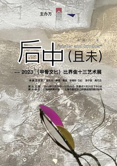 隹2023年11月25日下午2点,由上海梧桐美术馆和上海比界文化传播有限公司共同主办的《后中(且未)-- 2023 (甲骨文匕)比界隹十三艺术展》即将开幕!展览地点在上海市嘉定区江桥镇金园四路 258 号上海梧桐美术馆,展览日期为2023 年 11 月 25 日至 12 月 25 日。展览由邹东方、秦佳、汤宁容、周巧云、安晓彤和唐添6位艺术家共同举办。展览具有很强的专业性,展出的原创作品具有很高的艺术造诣,呈现了艺术领域的最新探索和成果。展览旨在通过艺术的方式实证“半边天”中国人,探讨并展现"后中"这一主题,展示人类命运共同体-“半边天“中国人的视角。