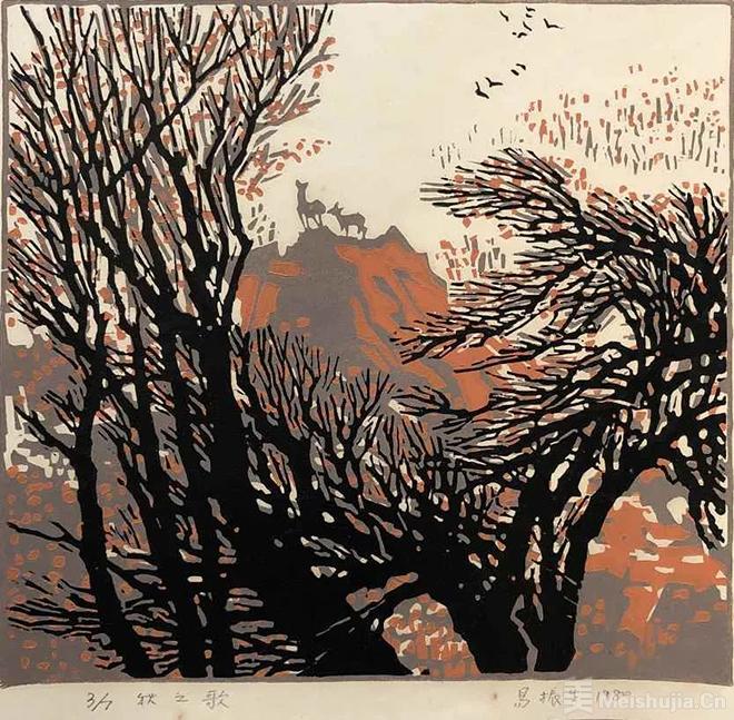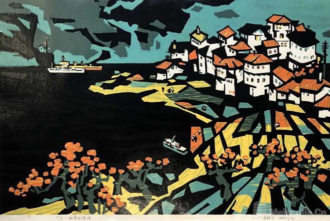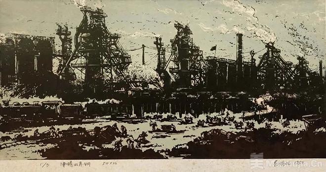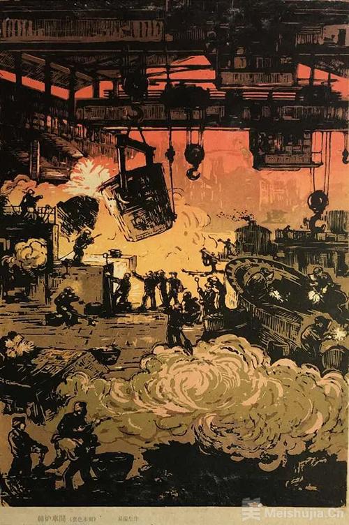 易振生是20世纪新徽派版画的代表人物之一,他专注于创作工业题材版画,画风简洁有力、气势磅礴。易振生的版画代表作《转炉车间》描绘了「大跃进」时期工人们在钢铁车间里工作的场景,整幅画面以橘红色为主色调,既是火光跃动的实景,又象征着热火朝天的生产状态,带有鲜明的时代烙印。