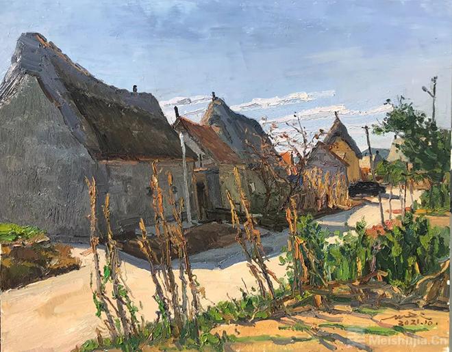 我知道,心浮气躁是当下社会的通病,只想着快速出名,一门心思走捷径而又不愿付出辛苦的人随处可见。而我则甘愿自我放逐,抱持画家应有的操守与本分,寂寞坚守,独自面对,拥入自然,神清气定,安安静静的在我的画布上慢慢画画。我深知自己画的很老实,很传统,甚至画的很笨。我不会熟练的套路,也没有伸手即来的熟练方法。在面对每一幅画时,都投注了我的真情实感,面对每一个场景时,都是对我一次从零开始的考验。每当看到那么多淳朴善良的目光在看着我一笔一笔的画画,听到他们以质朴的审美品评着我描绘他们家园的作品,间或品尝一下他们发自内心的善良而热情递过来的煎饼、粽子、鸡蛋、花生、地瓜、大葱、苹果、柿子等等,我的情感立马会连接着地气,我的内心顿感充盈踏实。我愿徜徉在这富有情感的世界里,脚踏实地,认真画画,用我的油画作品记录下我们这个时代的真实景象。我只是一个画画的人,没有资格自我标榜为人类思想和灵魂的导师,老老实实做人,踏踏实实画画是我的人生信条。我最关心的是能否画出一张自己满意的油画作品,会否在画中有一点点收获和体会。毕竟我的作品比起我的自然生命留存在世间要长许多。