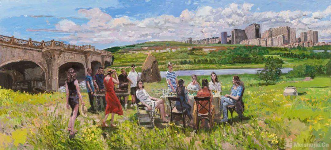 画有地域之风。东北油画在中国油画的格局中有着鲜明的地域特征,那就是表现性油画风格。作为东北表现性油画的代表画家,王建国早年即形成了表现性语言的追求:下笔恣意,充满感性;色彩强烈,诉诸直觉;肌理厚实,富有张力;光影斑驳,意态浑然。这些年,他在表现性语言的基础上进一步拓展,把“表现”和“写意”的结合作为研究课题。如果说“表现”是吸收西方现代绘画语言的话,“写意”则是朝向中国文化传统和东方感受方式的自觉,二者的结合在不少油画同仁那里已成为学术共识,体现出构建“写意油画”的路径。王建国在这方面的追求使他的作品呈现出悄然的新变,在取景布局上更加注重置身“现场”的整体感受,环视四方而取舍组合;在塑造形象时更加注重营造画面意境,下笔明确而气韵贯通。他善于一方面用刮刀厚涂重抹,任色彩在画面互补碰撞,一方面用中国毛笔勾画细节,使线条在空间穿插交织,两种笔法相辅相成,在视觉上形成强烈的张力。相比起前些年的作品,他的作品更具有一气呵成的内在韵律,把无意识的书写和刻画性的造型有机结合起来,形成“写意油画”的一家风格。