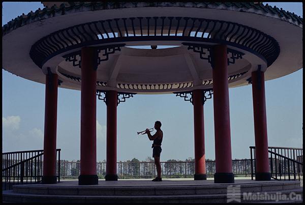 在拍摄这个项目的同时,振宇也走出了影棚,将镜头对准鸭绿江的河岸以及丹东的街头巷尾中的人群和风景,于是我们看到了《东北民谣》中的那些典型的东北画面:江边风中烈烈飘舞的旗帜,钟表摊位前的踟蹰的老人,以及凉亭里吹响的小号。这条国境线上的鸭绿江也带来了一种强烈的疏离与连接同时存在的矛盾感,成为了一个融合了情感与记忆的场所。就像是段义孚先生提出的“恋地情节”,人们与养育自身的土地之间,生长出根系般深沉的精神连结,在《东北民谣》中,我们可以看到一幅感知乡土的地图在蔡振宇的镜头前展开,那些在城市中成长和生活的记忆已然融入进江水和雪花。