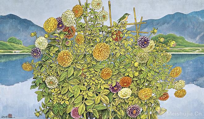 犹如袁隆平,祝大年获益于艺术品种的杂交,他层层染色,极尽花卉华丽之能事,但这华丽展现的并非轻盈可掬,令人于欢乐中感受愁思。朴实之美,苦涩之美,人生之大美,生命终极之回归。花如是,苍松更曲腰驼背,背负人世之重;高树参天,寰宇无边,人兮人兮奈若何。