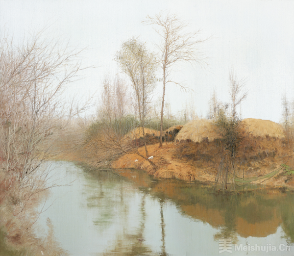在风景创作中,他的视野从苏北故里延伸至广袤中国:田垄水洼的春绿、覆雪村落的冬白,是乡愁的具象化;异乡山野的晨雾、戈壁的落日,则是对自然多样性的诗意回应。他笔下的风景从非“复刻自然”,而是“心象的投射”——光影是情绪的注脚,季节流转是时代变迁的隐喻,那些凝结在画布上的晨昏与草木,既安放着个人的缱绻乡愁,也见证着祖国山河的肌理变化。
