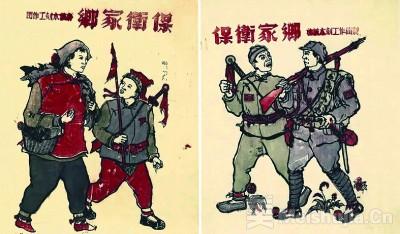 其中彦涵的《保卫家乡》,巧妙地将传统年画中的神祇形象替换成了抗战中的军民形象。画面借用传统年画的组画形式,右幅塑造八路军和民兵形象:八路军战士肩抗步枪,民兵则背负大刀,他们边走边说,似乎在讨论着刚刚发生的激烈战斗。左幅则塑造了农村妇女和儿童的形象:妇女手挎竹篮,篮中可见刚做成的布鞋,左肩耷拉着修补好的八路军军服;妇女旁边的儿童,肩背大刀,手拿红缨枪,头戴虎头帽,一副儿童团员的模样;儿童的目光看向妇人,似乎在询问战斗的情况,妇人目向前方,边和儿童交谈边快步行走,急切地要去慰问前线下来的战士们。这幅“新门神画”在形式和内容上产生了叙事联系,让老百姓和抗日战士感受到真实的情感与力量,从而进一步激发了军民团结抗战的决心。其后,彦涵在此基础上创作出的新年画《军民合作 抗战胜利》,成为抗战宣传最具影响的新年画作品之一。